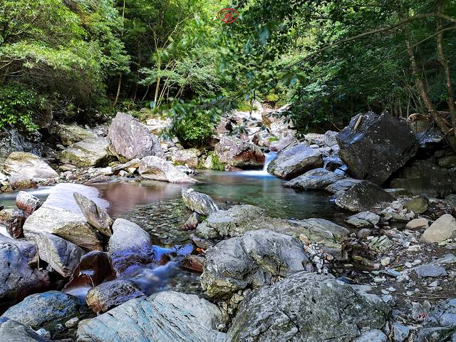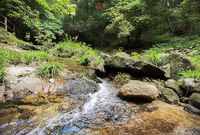 但由于时间的关系,我们进入百丈崖后没有深入,只走了一段,便被这里清澈的溪水吸引来玩水了,溪水透彻,鱼儿欢快的游泳,拖鞋下水,冰凉至心,感觉这一天都不会中暑啦,舒服极了。