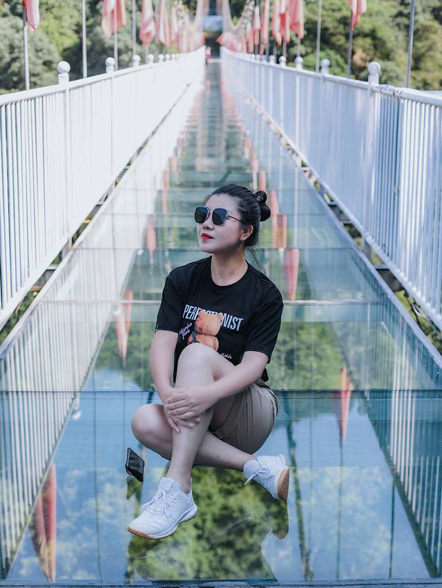 玻璃桥两岸的风景还是很美的,玻璃清澈见底,走在上面,可以清晰的看见脚下的悬崖,可惜我是个怕高的怂人,眼望前方一口气走到尽头才罢休。