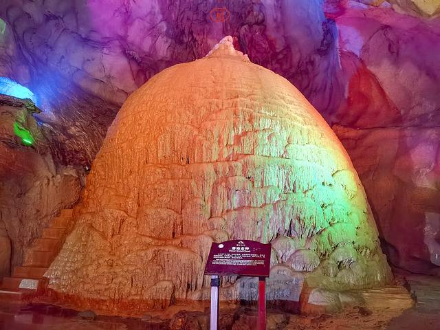 其次就是溶洞内的天然钟乳石群,最让我震撼的一个是9米多高的巨型钟乳“落地金钟”;另一组就是巨幅自然山水壁画,也是天然形成的;最后就是先前提到的白色透明的“罗纱帐”,导游介绍这是碳酸钙结晶组成的奇景,白色透明,造形奇特,形象逼真,色彩纯净,为国内其他溶洞所不及。