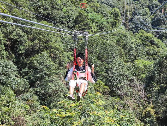 玻璃桥旁边的滑索我也喜欢,背着所有的东西先称重,然后在下面的工作人员会根据你浑身上下的重量来配重,滑在森林之中的感觉,就是“太凉快了”!