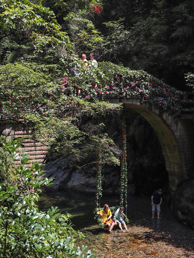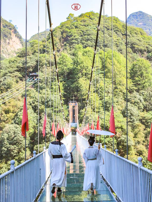 不要看百丈崖小,但这里风光也不输别的景区,谷幽泉深,风景秀丽,有高大瀑布、深潭、峡谷地形,垂直落差100多米的百丈飞瀑尤为壮观。在这样的环境下,景区其实有设置很多可以用来户外探险的体验,比如攀岩、走梅花桩、滑索、空中飞人、过情人桥、走钢丝等。