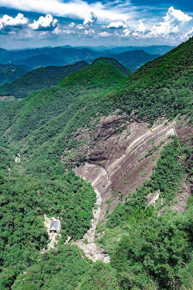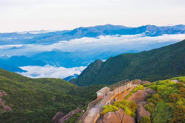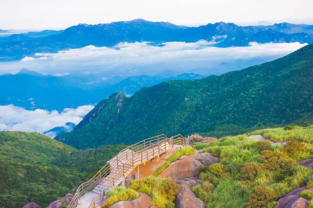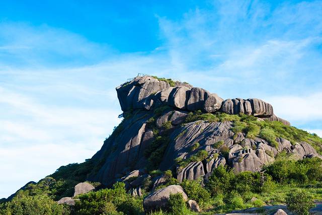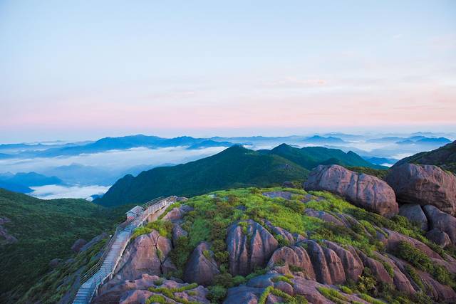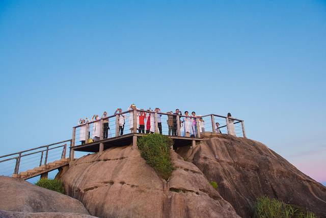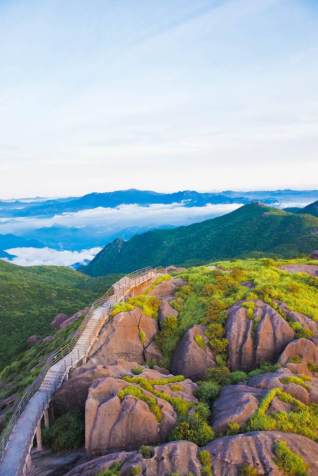石牛山主峰海拔1782米,因主峰巨石像一头仰天长啸的牛而得名,被誉为“八闽观日第一峰”,是中国两处放射状古火山爆发口之一。主峰多为岩石坡面,山势陡峭,在此既能众览群山、登高望远,也是观看石牛山独特三大景观日出、云海、佛光绝佳之地。从石壶殿到山顶,分布着许多形状各异的巨石,有法网、石交椅、飞凤石等,这些石头是水蚀花岗岩石蛋地貌和崩塌堆积地貌构成的,是石牛山特有的地质奇观。没有亲眼看见以前,是很难想象会有如此绚丽夺目的日出景观。