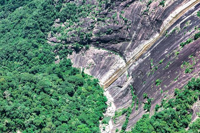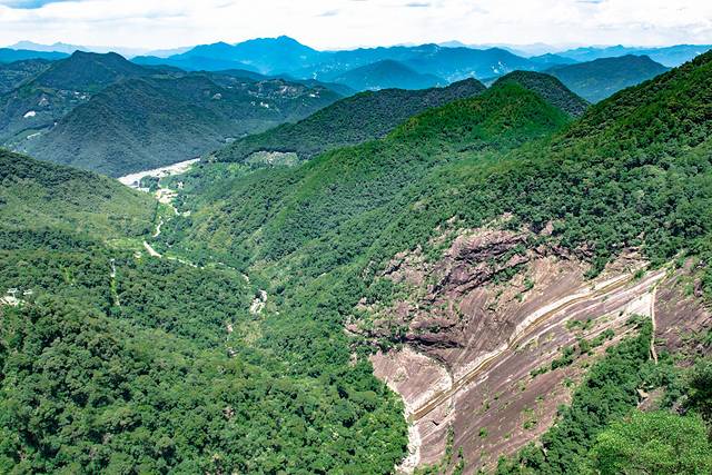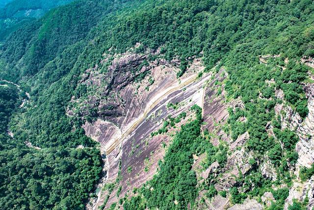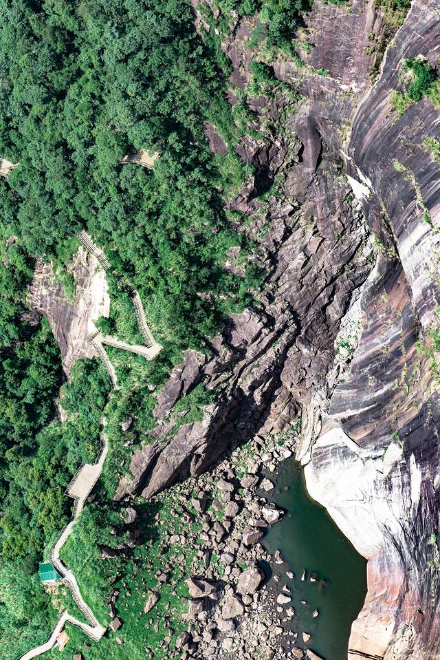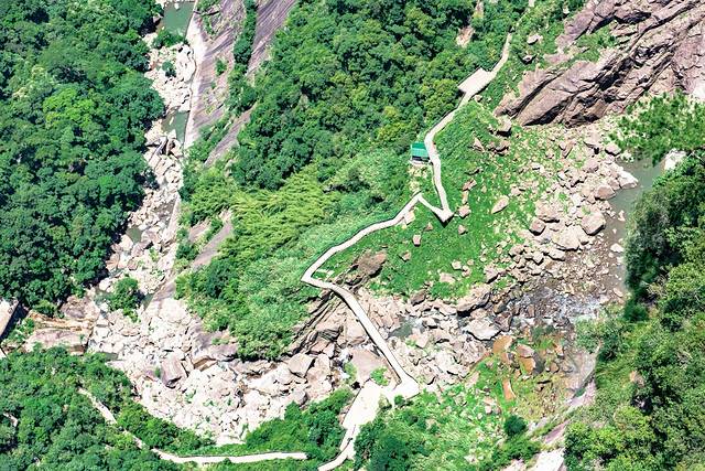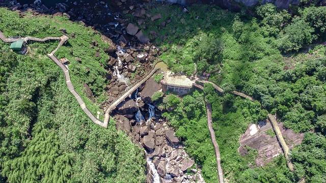 时间充裕的话可以从天空之心走心形栈道下山,它位于岱仙瀑布两侧,心形栈道全程 3000 米,单侧1500 米左右,是中国唯一的心形立体环瀑栈道,从远处看两边的栈道整体呈一个心形,走到瀑布底下大约要一个小时。我们一起走过心形路,石牛山就也是我们爱情的见证者了。