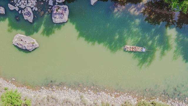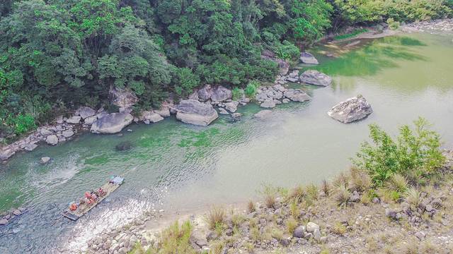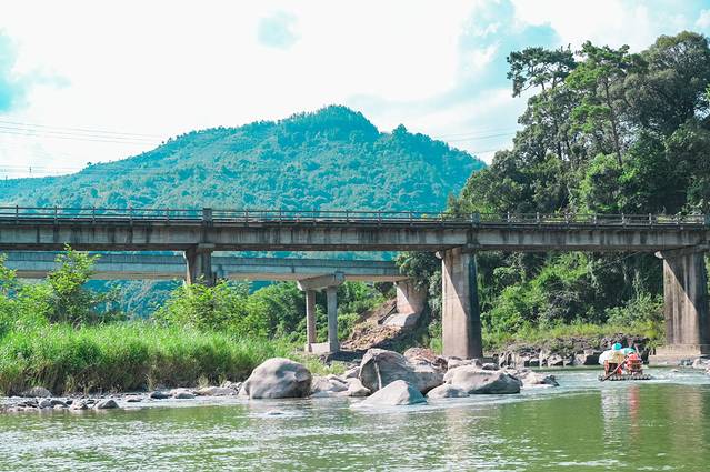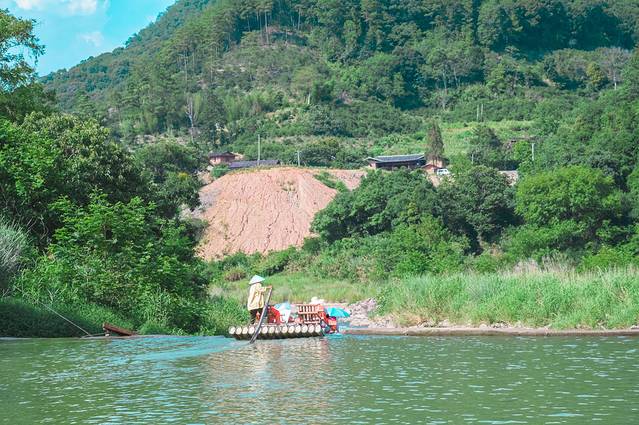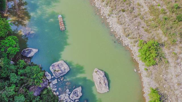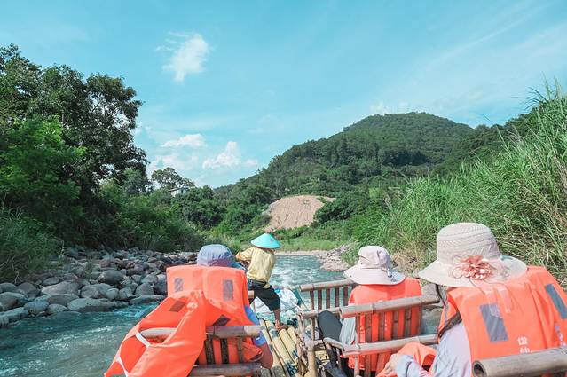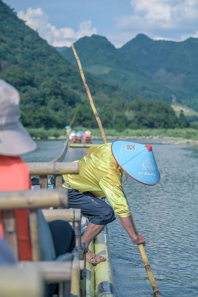 两岸都是石头,水很清澈可以看到底,因为路势狭长还崎岖,刺激的漂流就应运而生了:我们坐在竹筏的竹凳上,看着戴着斗笠的船夫撑起杆来控制竹筏,一条长杆前后摆动来就能操控速度和方向,这技术可不是一朝一夕就可以轻松学会的。乘坐的时候要注意安全,是我们男同胞们展现男友力的时候,不能掉以轻心。