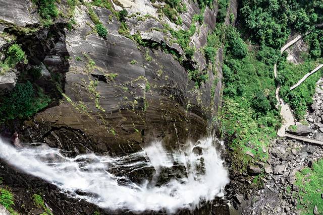 隔着玻璃往下望,底下的岱仙瀑布和蜿蜒的山路清晰可见,天上的云朵都倒映在玻璃上,上空和下面隔着玻璃融合在一起,实在是美好又独特的体验。站在这里看下面的瀑布和刚刚的从山底看到的角度又是天壤之别,俯瞰岱仙瀑布全景绝对是另一种风味。