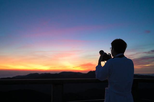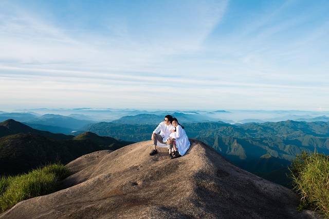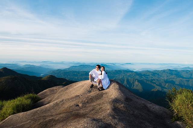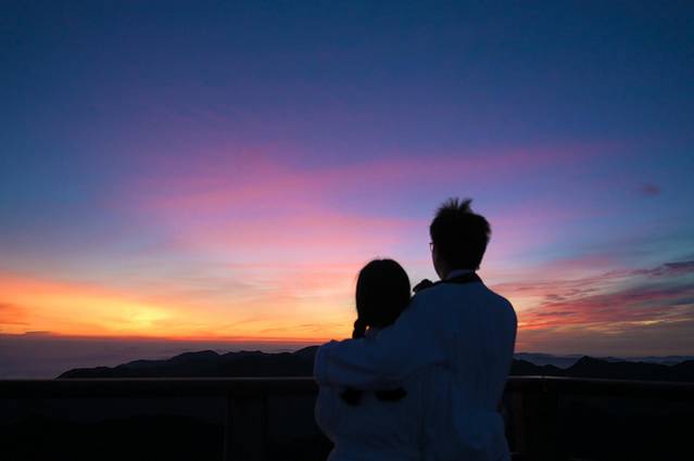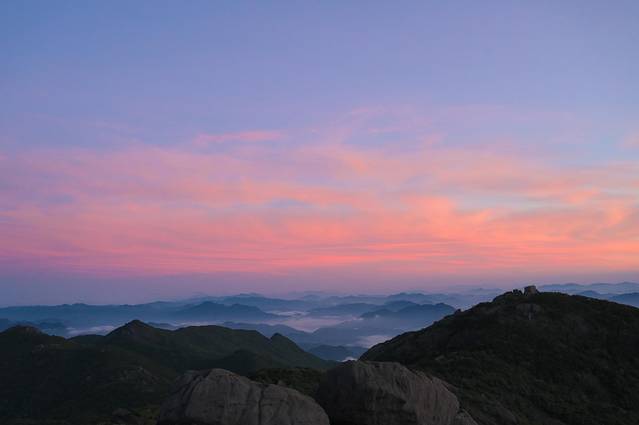 我们起了大早出门,终于赶在日出以前登上石牛山的主峰,找到观赏的绝佳位置。清晨徒步而上,看云海与旭日同框。爱情就是要一起去发掘到独一无二或者极少能看到的美景,一定要跟你爱的人一起去看一次日出,看着太阳一点点发光、露出头,云彩被天空染成紫色、粉色、黄色——一层一层的渲染开,主角太阳就慢慢升起,最后变成耀眼的黄色。日出东升神光照,疑似云海有仙来。跟着太阳的步伐,我们只想在石牛山主峰上紧紧拥抱。