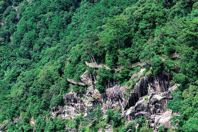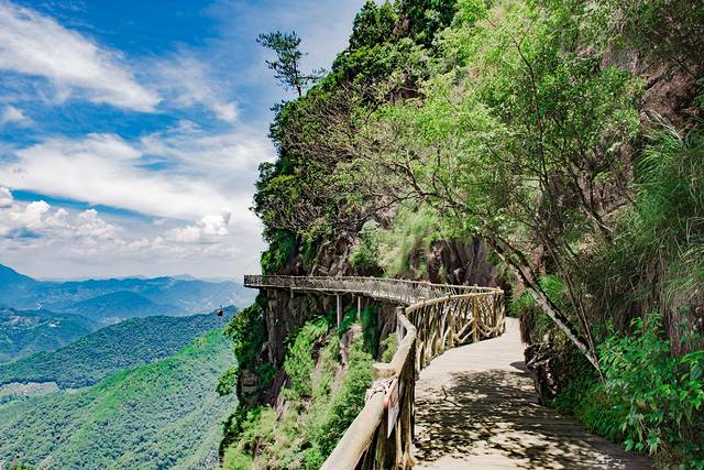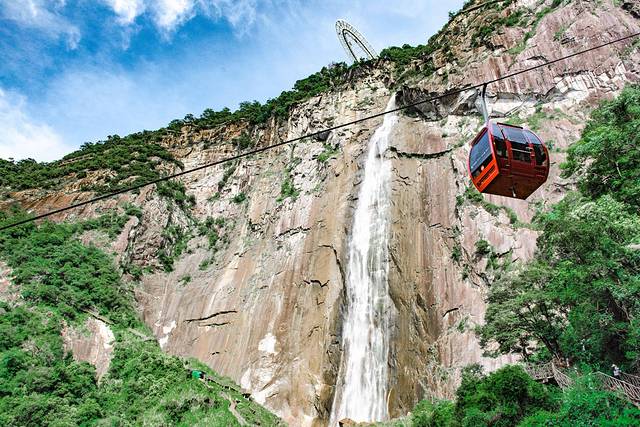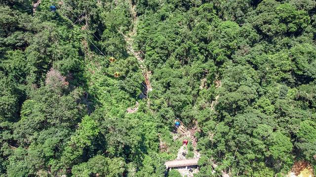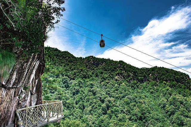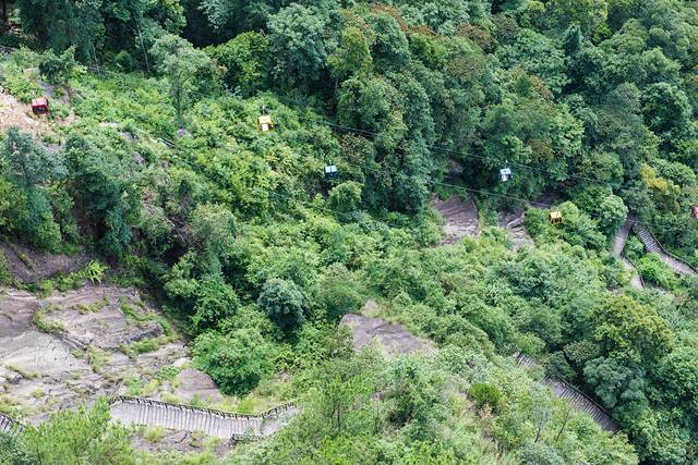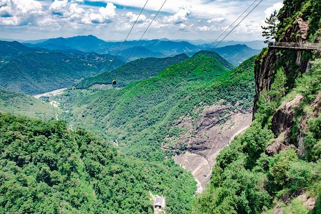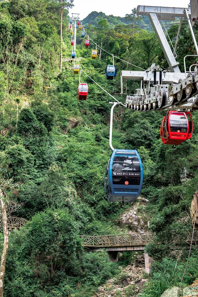 坐着索道就可以缓缓上山了,这条超长索道全程7.2千米,单程运行大约要半个小时的时间,是目前亚洲第二长,国内跨度最大和坡度最大的索道,缓缓在山林中穿过,可以从高处俯瞰到整个各种景色:瀑布、断崖、森林、竹海、盘山公路。缆车缓缓行进,沿途穿越竹林峡谷,漫山竹海郁郁葱葱,还可正面观赏到壮观的岱仙瀑布。随着海拔越来越高,还可看到成片成片的黄山松和灌木林,感受在树梢上滑行的刺激,领略峰峦起伏、林海莽莽的气势。高高的山峰坐缆车,省下来好多力气玩后面的项目,还可以观赏好看的景色。
