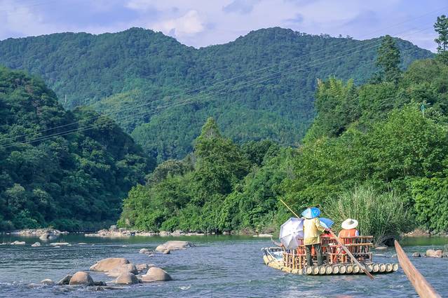 来到石牛山夏天一定要体验的项目就是景区的岱仙溪竹筏漂流,当然其他季节来也可以,岱仙溪天然堤坝,全年水量充足,一年四季皆适宜漂流。岱仙溪竹筏漂流总长6公里,四周群山迤逦,水流澄碧清澈,途经九濑、九潭、九弯十八曲,惊险刺激,被誉为“闽中第一漂”。沿溪两侧生态环境良好,风光秀丽,有众多的古树群,亚热带藤本植物,还有温泉。两岸的主要景点有天然小岛、情人树、古树群、五仙听雷、石狮潭、天平城古城址、桃花岛、调丁潭、三潭映月、迎客松、莲花台、湖内宫等。