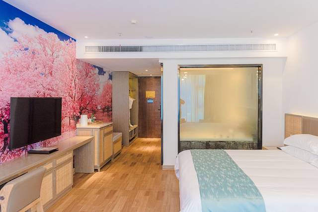 到达石牛山可以选择先在山下岱仙酒店入住,酒店依山傍水,集康养、休闲为一体的高端度假酒店,清晨起早打开窗户你就可以感受窗外亲切的大自然,放肆呼吸这里新鲜清新的,空气、整个酒店以暖色调装修,明亮宽敞、设施齐全。我们情侣间的大床房里是粉红的樱花树主题,温暖贴心,床垫柔软舒适睡起来超级舒服,游玩前后返回到酒店心情也会大好,我们终于可以睡个好觉啦。