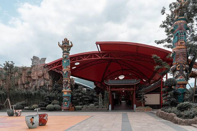 来到景区门口步入图腾大道,千古情标志性的图腾立柱、四面美人像便赫然出现在我们的面前,这很千古情!