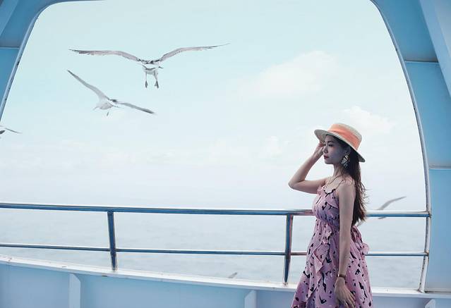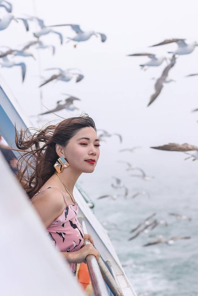 在甲板上,享受海风的吹拂也是颇为享受的一件事情。远眺海驴岛,海驴岛远看就如一头卧倒在海上的驴,岛上绿意盎然,空中海鸥盘旋。