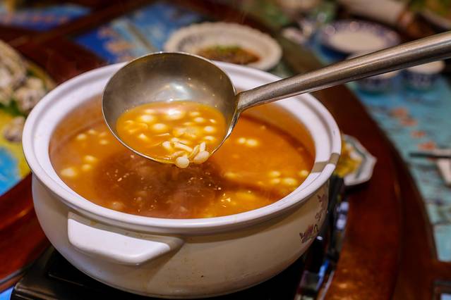 用豆腐等材料煮成汤底,再加入新鲜的海胆。海胆鲜甜的味道非常浓郁,搭配其他材料,汤的味道浓厚,每一口都有着丰富的味道。