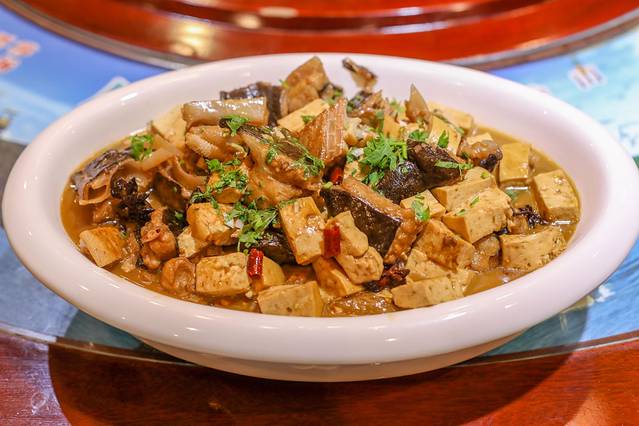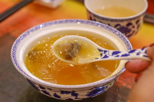 新鲜的海参切小块,加入葱花上桌。再浇入用小蘑菇、干贝煮成的汤,汤微酸微辣,加上干贝非常鲜甜。海参被滚烫的汤烫熟,保持了最鲜嫩爽口的口感。