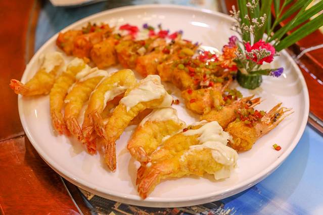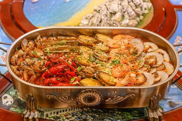 大铁盘中放入了海虾、蛏子、鲍鱼、小龙虾等海鲜,一起煮熟后浇入酱汁,微辣的酱汁更能勾起海鲜的鲜甜味道。而且各种丰富的海鲜能满足不同的口味。