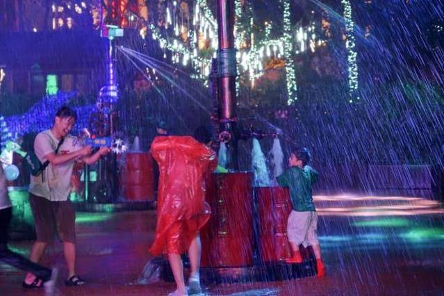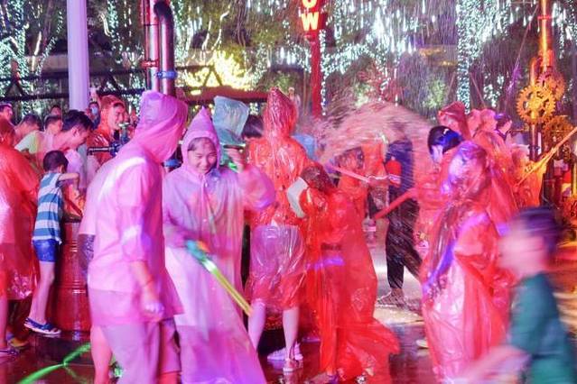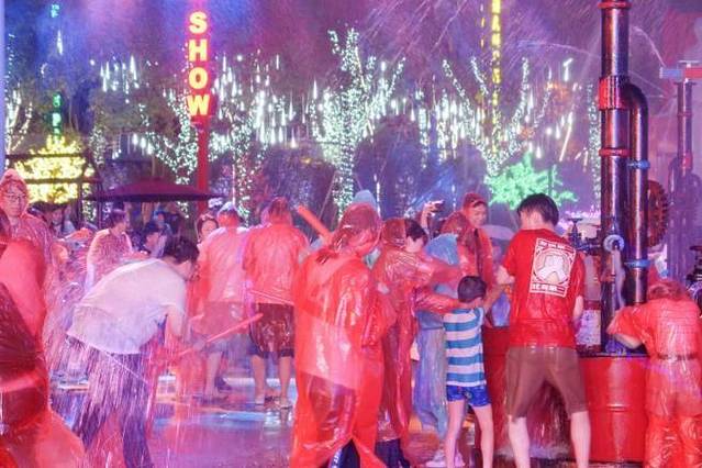 晚上19:10,在一楼露天有一场嗨到爆炸的《颜色狂欢夜派对》,一定要去体验!换上雨衣,拿起水枪、水桶,在人群中互相嬉戏玩闹,哪怕是陌生人,都能迅速熟络起来。台上的歌手为大家带来嗨爆的音乐氛围,在这里,你会不自觉舞动起来,玩水、呐喊……