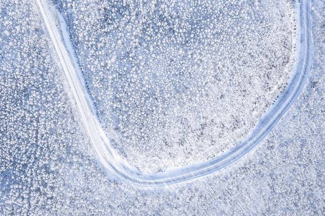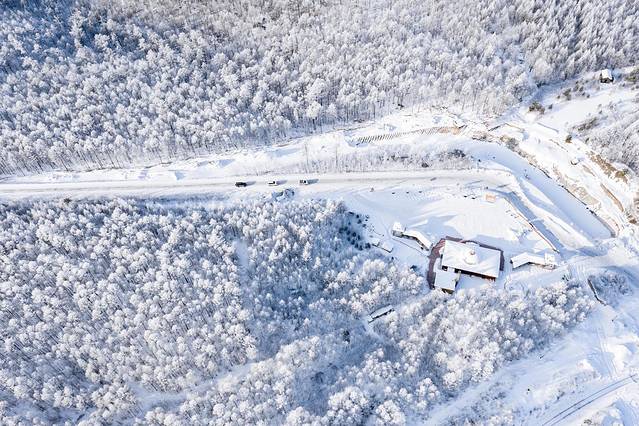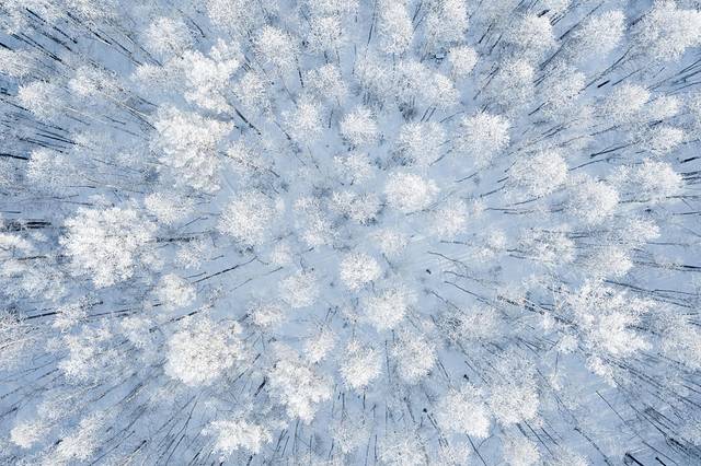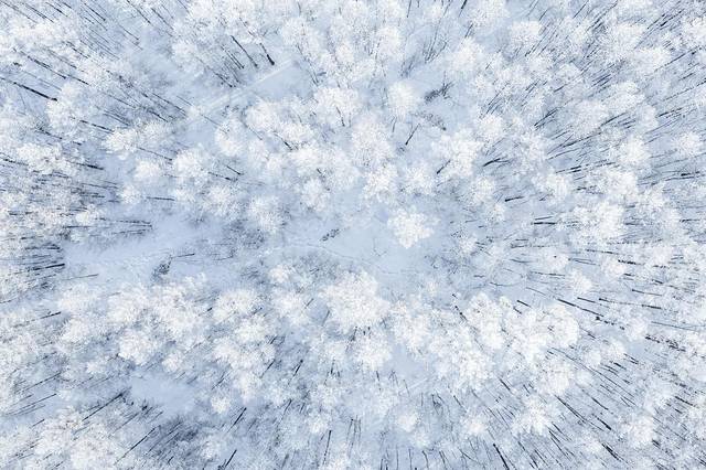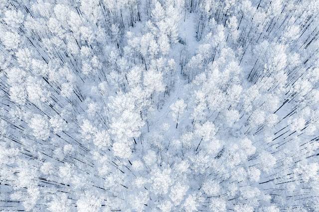 这应该是我见过最美的雾凇了,一片一片的原始森林,航拍下的雾凇一眼望不到尽头,林间的雪地还能偶尔看到一排脚印,不知道是什么动物出来散步还是寻找食物留下来的。