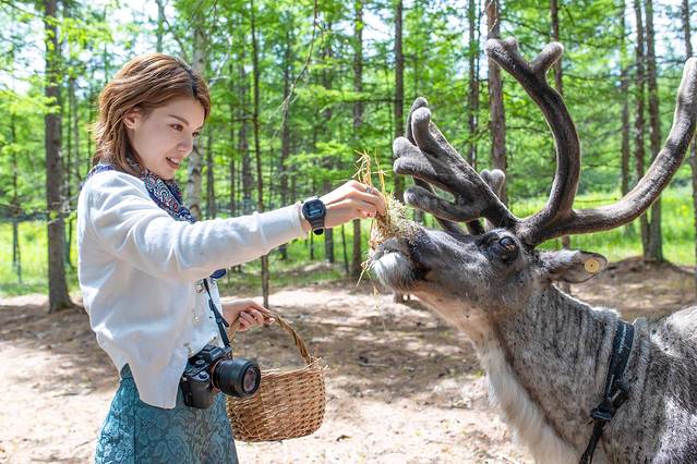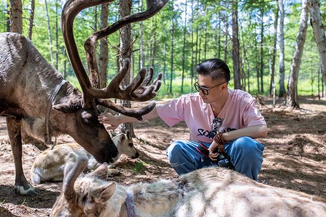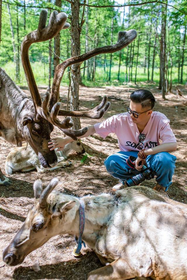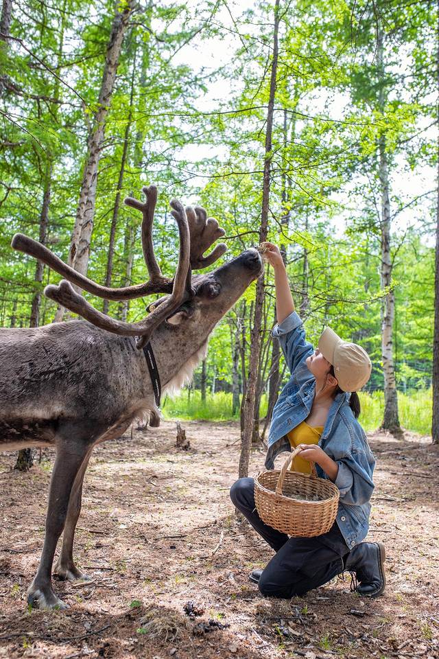 无论雌雄,驯鹿都会长出巨大的角。近距离观看,粗壮挺拔且带有分叉的鹿角仿佛长在驯鹿头上的大树。而驯鹿庞大的身躯和沉静的性情,又让它们充满神性,不由得让人对这森林里的精灵肃然起敬。