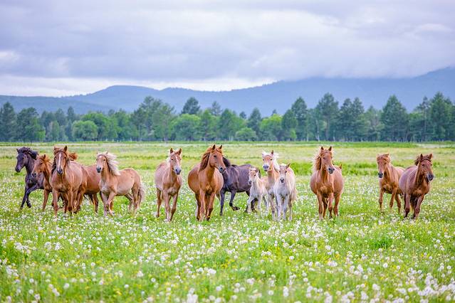 马儿在草原上自由自在的玩耍,草原上面长满了蒲公英和绿色的小花。