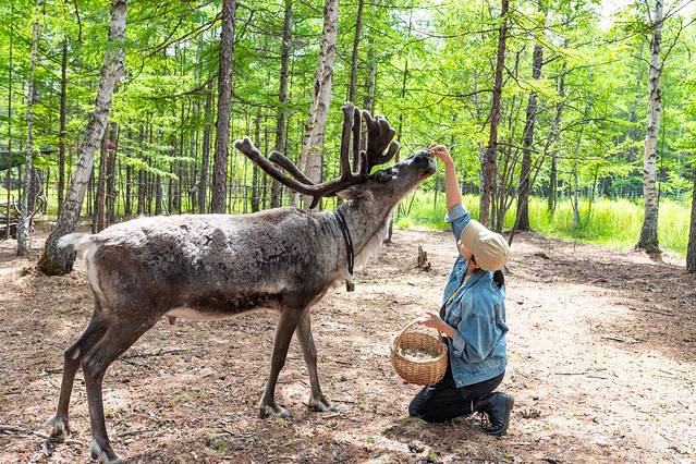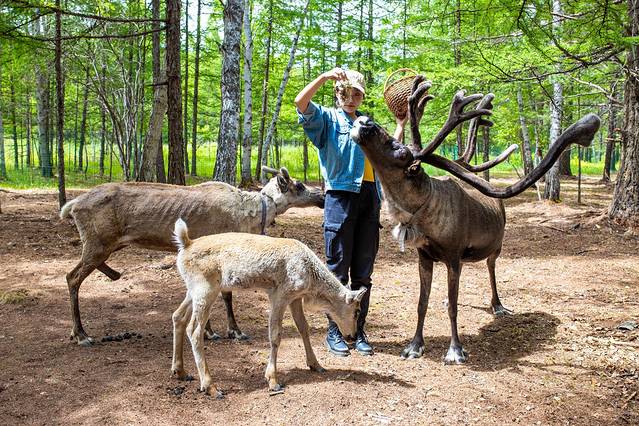 真正意义上的驯鹿为北欧拉普兰人和中国北方鄂温克人驯养的驯鹿,但在中国已经不会有野生的驯鹿了,在北方广阔的森林中,再也不会响起鄂温克人召唤驯鹿时敲响桦皮桶的声音了。我们现在见到的也都是变成景点的驯鹿园,在这里只能看到少部分驯鹿,大部分驯鹿都被鄂温克人放养到森林里面了。