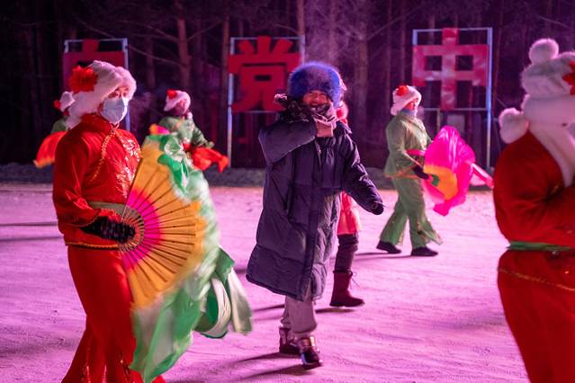 广场上还有很多扭秧歌的表演,很多游客都一起跟着载歌载舞,艾米也忍不住冲进去扭起来了。这个寒冷的环境,只有动起来才会感觉到温暖。