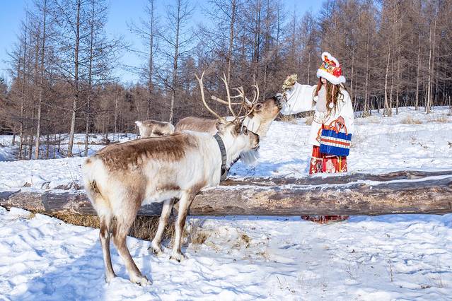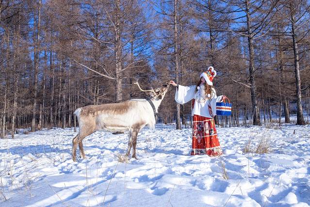 冬天的驯鹿也是大兴安岭的一种特色,驯鹿放养在鄂温克人牧场的森林里,带上它们的食物就可以和它们近距离接触了。嘉嘉和丸子最期待的就是见到驯鹿,还特意准备了服装拍照。