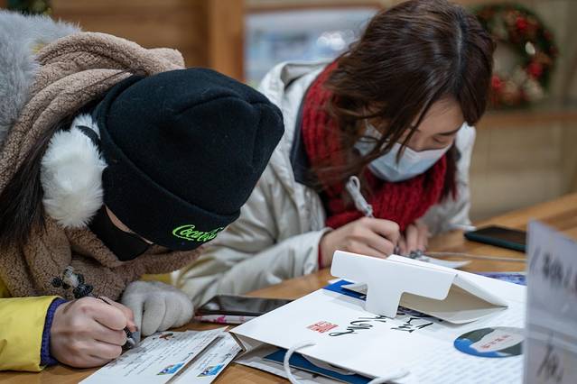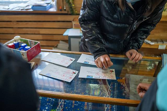 比较热门的最北邮局,进去就发现已经很多游客在里面,这里可以用明信片写一些文字,盖一个邮戳,把它寄给朋友或者家人。