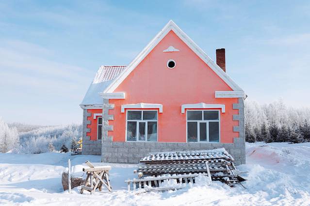 301公路上内蒙古段发现路边很多这样各种色彩的小房子,有的森林防护站,有的是森林管控工作人员住的。冬日里的一抹色彩,跟童话里的小房子一样。