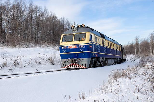 穿梭于大兴安岭的火车,路上正好经过一段雾凇停下来拍照,遇到火车路口的管理人员,告诉我们马上就有火车经过,提醒我们注意安全,于是我们就停下来等待火车的经过。