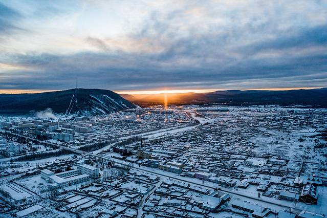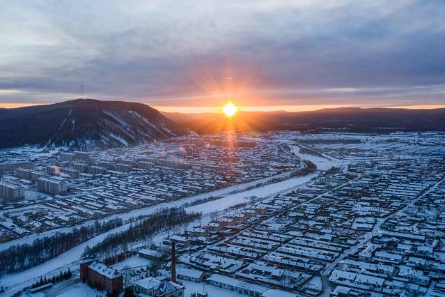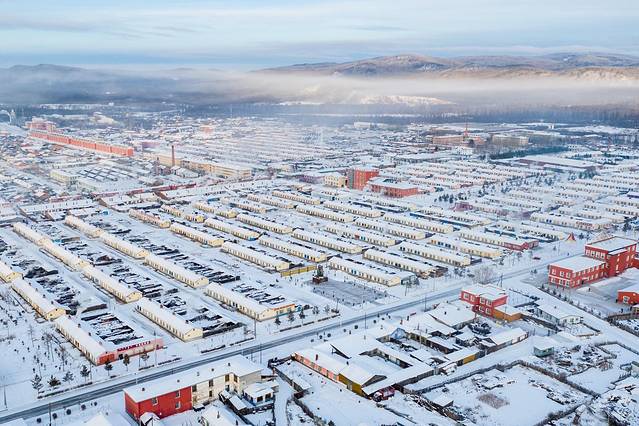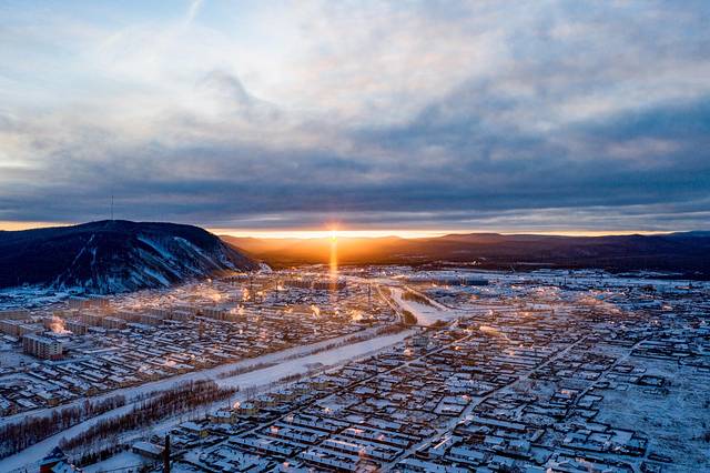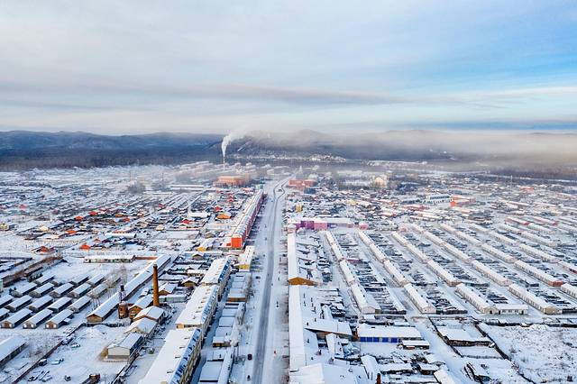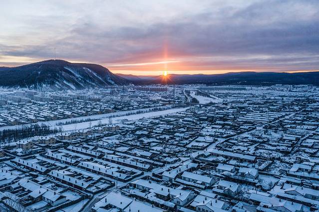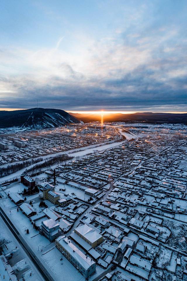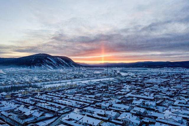 日柱现象搭配莫尔道嘎的城市景观,犹如魔界一样。
