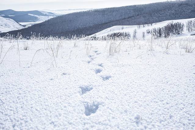 雪地上有一连串脚印,很明显就是野生动物的,应该是鸟类的。之后,我们还在附近遇到了一些,不过没能认出是什么鸟类。