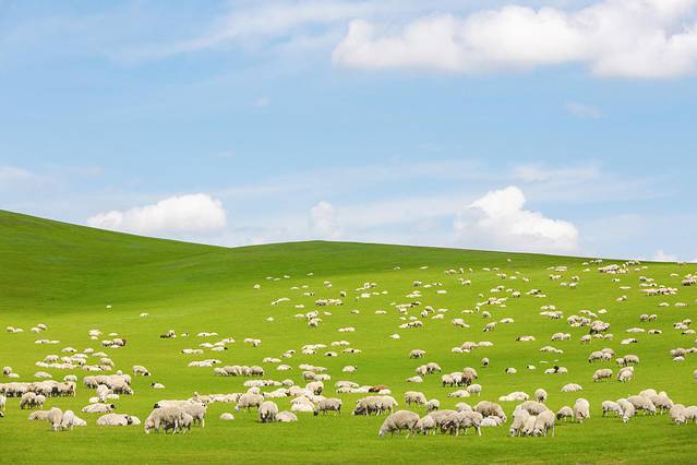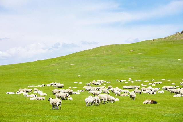 深入草原,美丽的画卷开始渐渐完美起来,“天苍苍,野茫茫,风吹草低见牛羊”的感受由然升起。见过国内很多草原,但是呼伦贝尔这种无边无际的草原还真是让我感受到了它的魅力。羊群就那么悠闲的在草原上散步,穿越途中经过一处又一处不同牧民家的羊群。