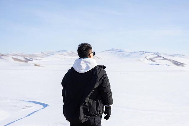 我们穿越的大雪原就是莫日格勒河草原,应该是我见过的最大的雪原。大到无垠,大到无界。站在雪原上环顾一周,四面都是茫无涯际的天空,雪原仿佛和天边相接。冬天的莫日格勒河基本都已经完全冻结了,还能若隐若现的看到一些河流弯曲的轮廓。