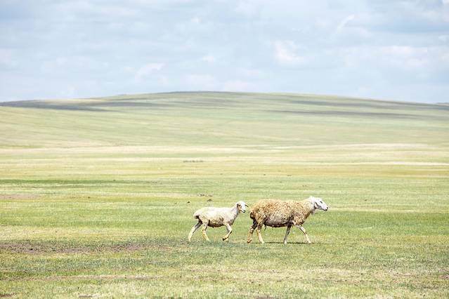 6月的呼伦贝尔草原,海拉尔莫日格勒河草原的外围还是有一些黄绿色,广阔显得有一些寂寥无声,路过的小羊给草原增添了些许色彩。