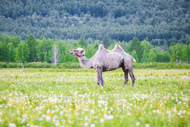 惊奇的发现这片草原上还有一只骆驼,应该是附近村庄放养在这片草原上的,只不过草原和骆驼的奇异搭配,让旁边的一群马儿如临大敌,不停地围着它转、骆驼好像成了这里的王者,抬头望向马群,马儿就飞奔的被惊走了。