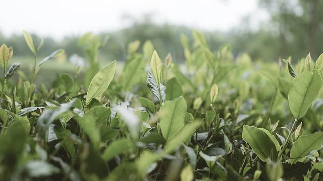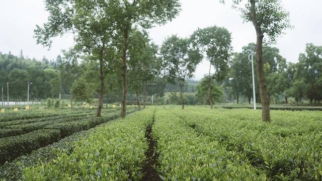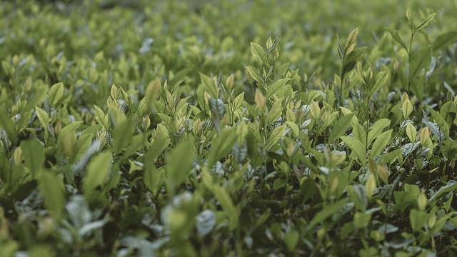 烟雨朦胧,茶叶在烟雨中俏丽,叶片尖端被染得愈发碧绿,享受着清风和雨露的滋润。