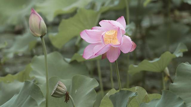每到夏季,荷花都会如期开放,一阵蒙蒙细雨过后,晶莹的水珠在花瓣上滚动,大多是粉红,粉红之中又有深深浅浅,聘婷地立于层层的万绿荷叶间。