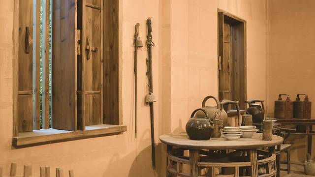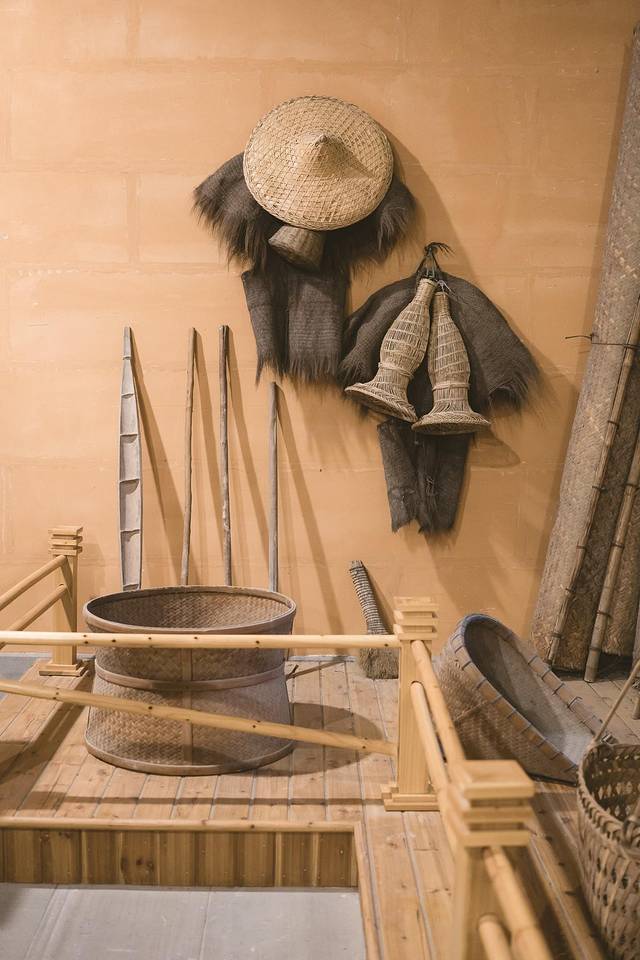 这个展区陈列着茶农采茶时的行头,蓑衣和有棕蓑衣和竹叶蓑衣两种,棕蓑衣用棕毛缝制,结实耐用,价格贵,被雨淋后稍重。而竹叶蓑衣轻便便宜,但不耐用。笠麻用竹篾编成,夹以宽大的箬竹叶,用以遮阳挡雨。笠麻分尖头笠和圆头笠两种,按直径尺寸大小和各地风俗流行可分为大埔笠、同古笠,九都笠、尖笃笠等。