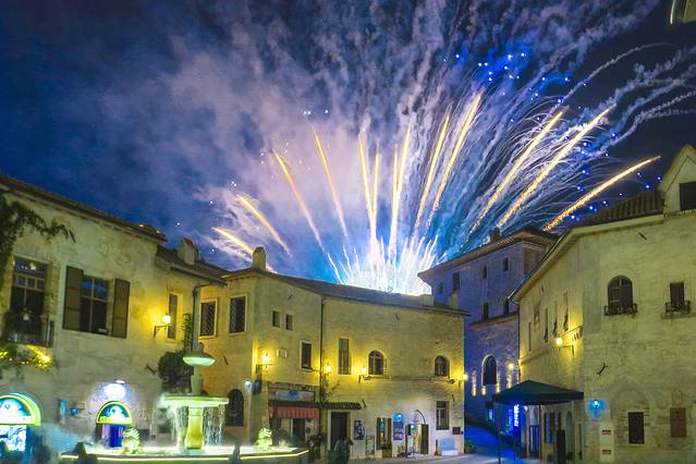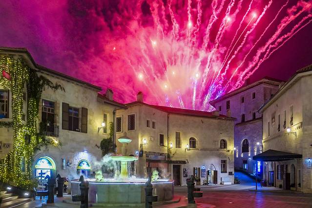 伴随夜幕降临彩色的焰火如流星一般升起,在城堡上空绽放出万千光芒,照亮半边的天空,浪漫且梦幻。