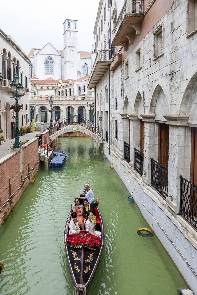 小镇从威尼斯引进意大利非遗匠人纯手工制作的贡多拉,邀请专业船员撑船,让游客可以乘坐两头尖翘的贡多拉漫游于威尼斯。