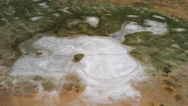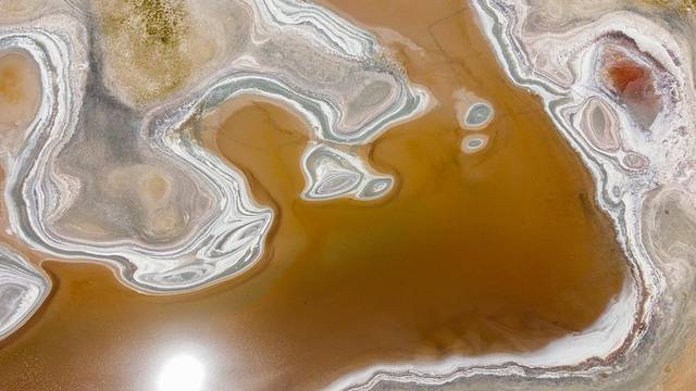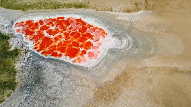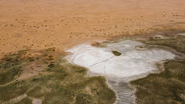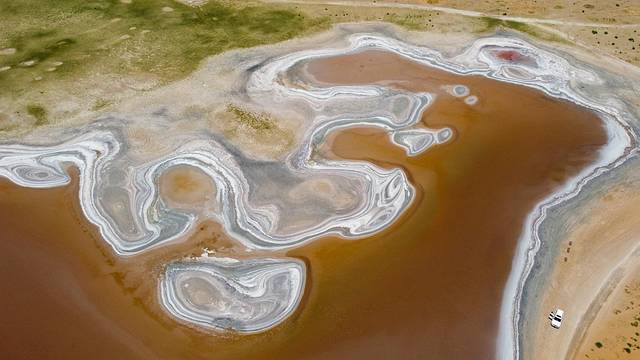 离苏海图湖不远处,便是此行中面积最大的太阳湖。在湖边看很普通,但在空中俯瞰太阳湖却格外惊艳,白色盐碱描边,黄色湖水填充,层次分明,构成了一幅奇特的抽象图案。