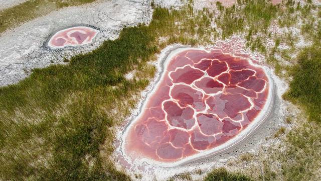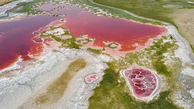 从天鹅湖离开行驶12公里左右,就抵达此行的重头戏——乌兰湖。乌兰在蒙语中的意思为“红色的”,数个珍珠串状的红色湖泊,酒红色的斑点点缀其间,散发出让人无法抗拒的诱惑。