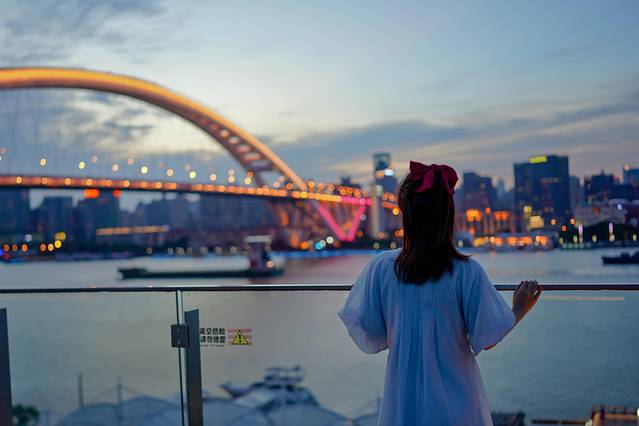 吃完晚餐,我们来到顶层露台等待悬崖音乐会,太阳渐渐西沉,远处的卢浦大桥灯光璀璨,夜色阑珊,属于魔都的夜晚总是最美的。