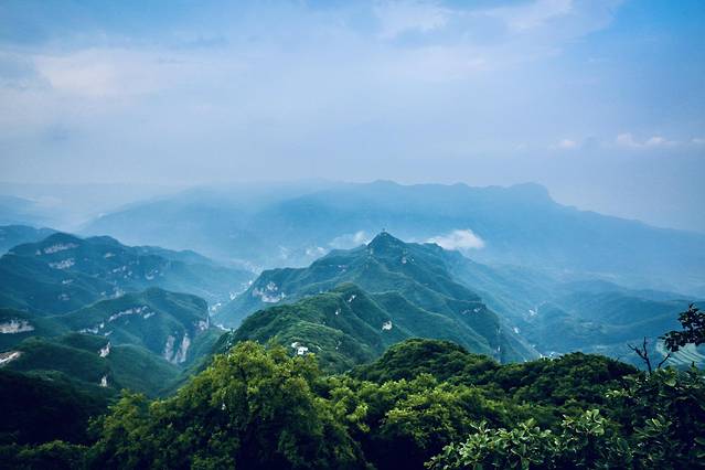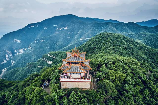 乘坐缆车快到达山顶时,从远处望去,便能清楚的看到玉皇顶。玉皇顶位于云丘山最高峰巅,海拔1629米。
