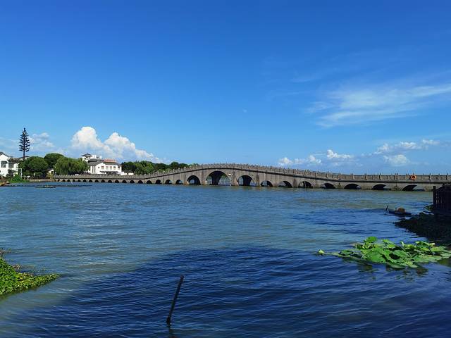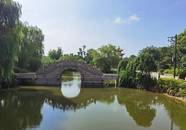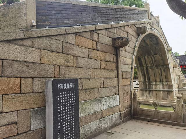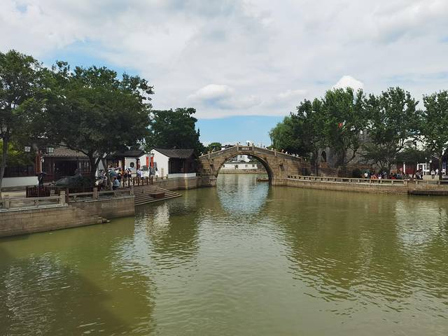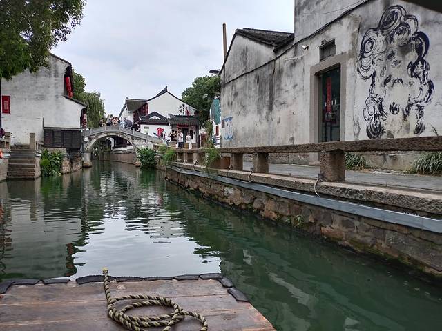 从寒山寺入口出来,对面的景区是枫桥景区,不过看不到枫桥。只有沿着景区一直走,拐弯后才能看到。实际上是一条弯弯的河上的两个桥,一个是枫桥,一个是江村桥。