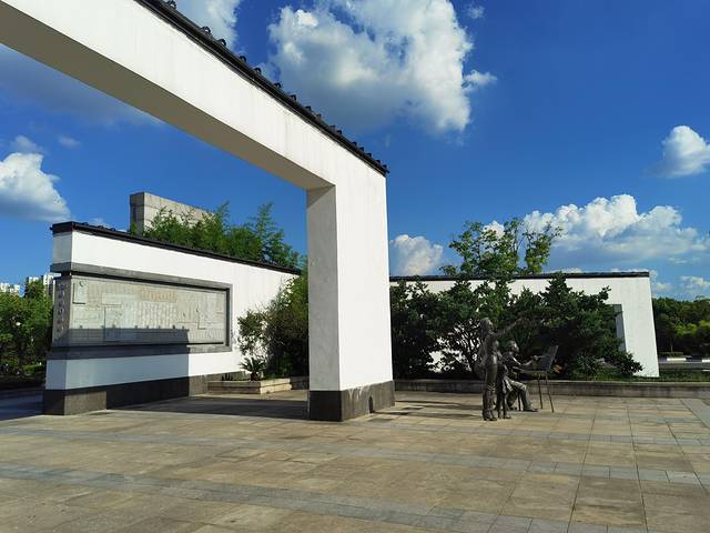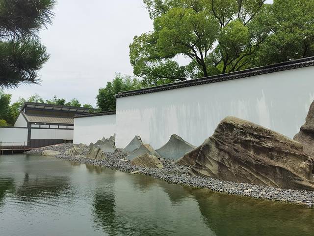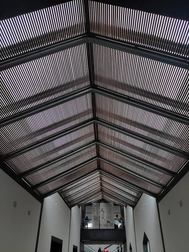从拙政园的南出口出来是一条小吃街,水果捞的价格太高,慎重购买。向西走50米左右就到了苏州博物馆。它由建筑大师贝聿铭设计,有着传统的苏州园林风格,高低错落,深灰色屋面与白墙相配,清新雅致。屋顶上金字塔形的玻璃天窗让博物馆内充满自然光线,在大门、天窗廊道、凉厅及各展厅都可以看到这个特点。馆中还有庭院、水池、石桥,既传统又现代。漫步在新馆庭院中,蓝天、白墙、绿竹、清水,十分惬意;走在石桥上还能看到白墙下用砂石堆砌而成的画,很有特点。