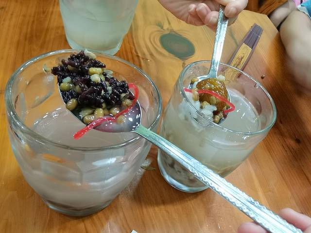 走的热了,进店喝了传说中的绿豆汤。特点:甜。加了糯米和蜜枣一枚,葡萄干,薄荷等。量大。