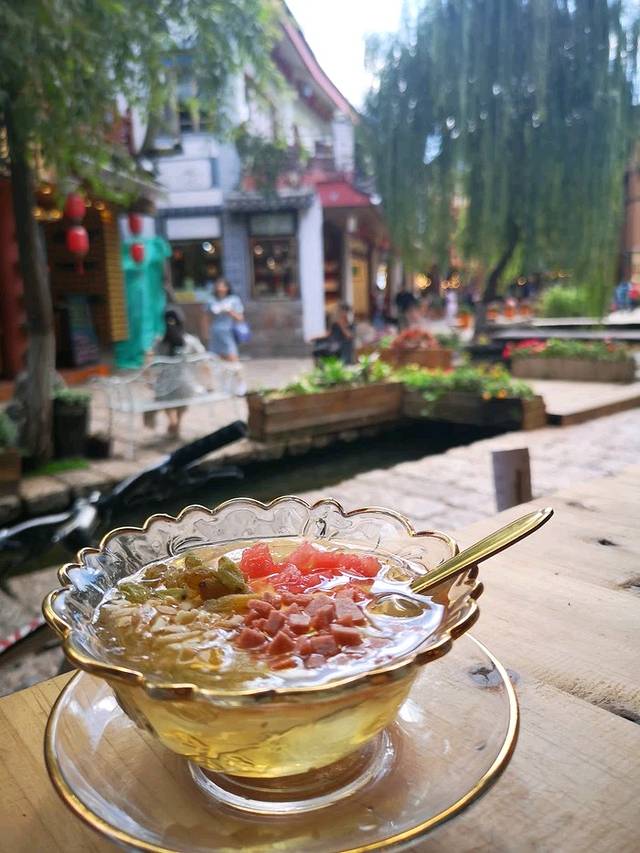到丽江旅游,游玩束河古镇,偶遇网红餐厅~大家都在激情的看奥运,菜量很大,鱼味道很鲜~河畔听着歌吹着风,很不错撒懒,躺平的地方~包菜炒的略微有点油大~不过味道不错~冰粉的小碗很美丽,味道也不错~和闺蜜两人的下午茶+晚饭就在这里解决啦~