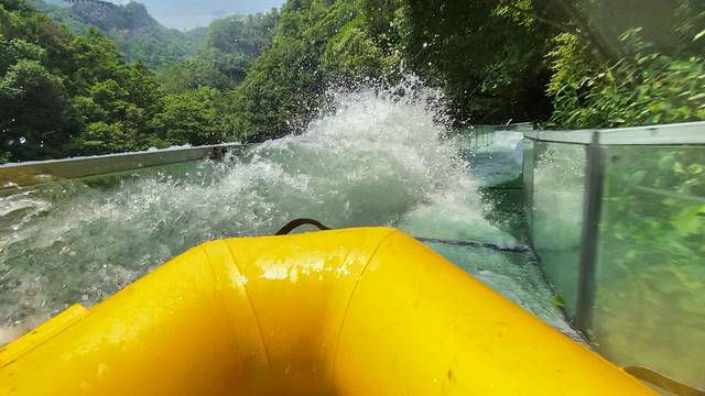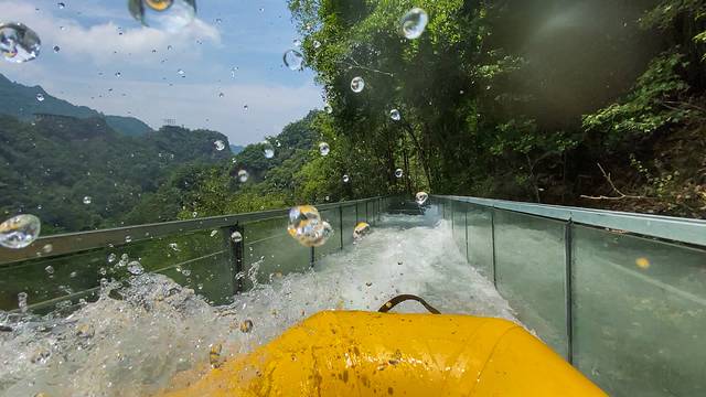 而景区内的网红高空玻璃漂流,全长1000多米、落差高达百米,也非常刺激。转弯、漂移、俯冲,穿梭于山间森林之中。特别是滑道的水流特别急,浪花特别大。几乎所有的游客都会湿身,妥妥的清凉之旅。