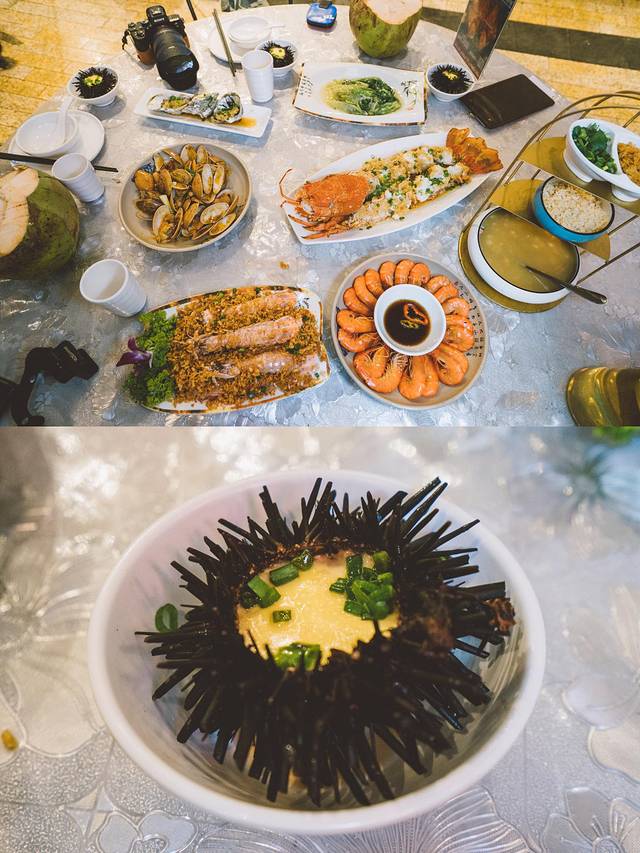 避风塘椒盐虾姑,南美白对虾、菲利宾肉蟹、海胆蒸蛋、小象拔蚌、波士顿龙虾、蒜蓉蒸鲍鱼、以及达叔龙虾汤海鲜泡饭。