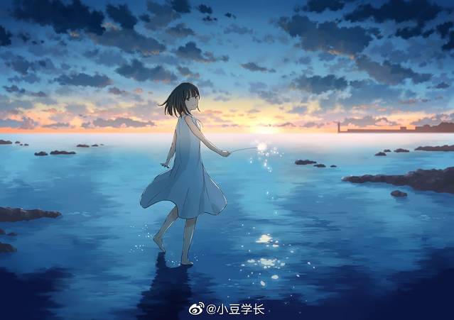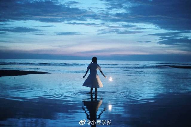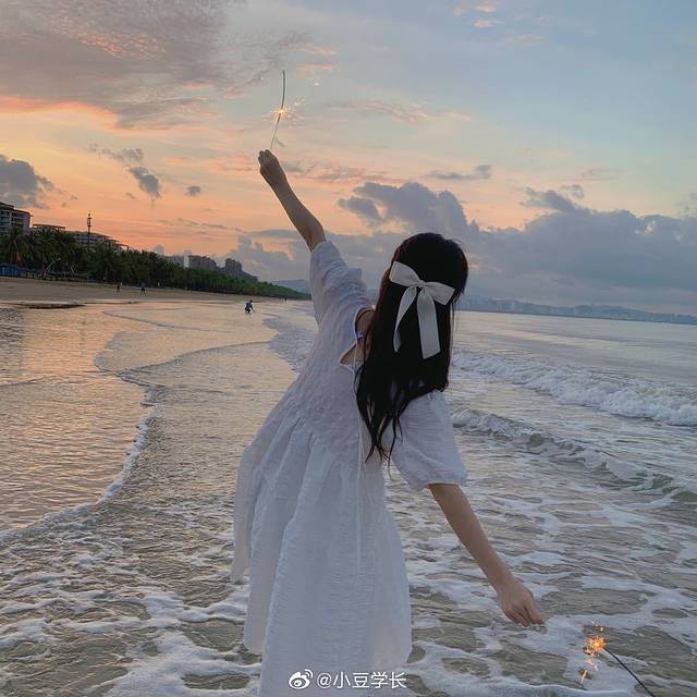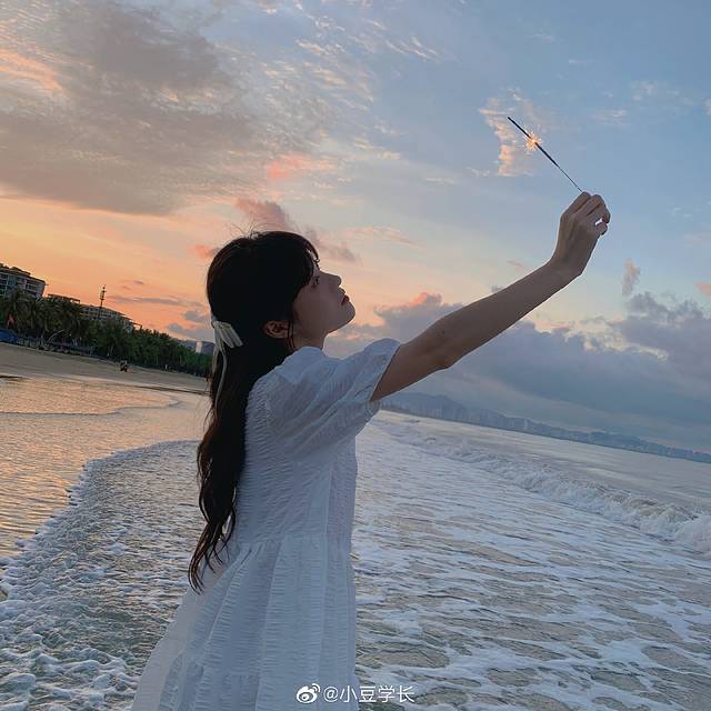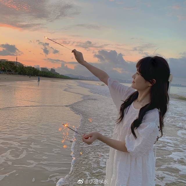 拿着烟花棒成为了一个绝美的道具,夏日海滩的清晨,太阳还没有出来,层次的云朵是真的太浪漫了。